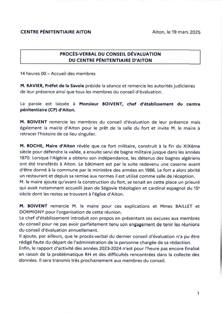 Vous trouverez ci-joint le procès verbal du Conseil d’évaluation du centre pénitentiaire d’Aiton du 19 mars 2025.
