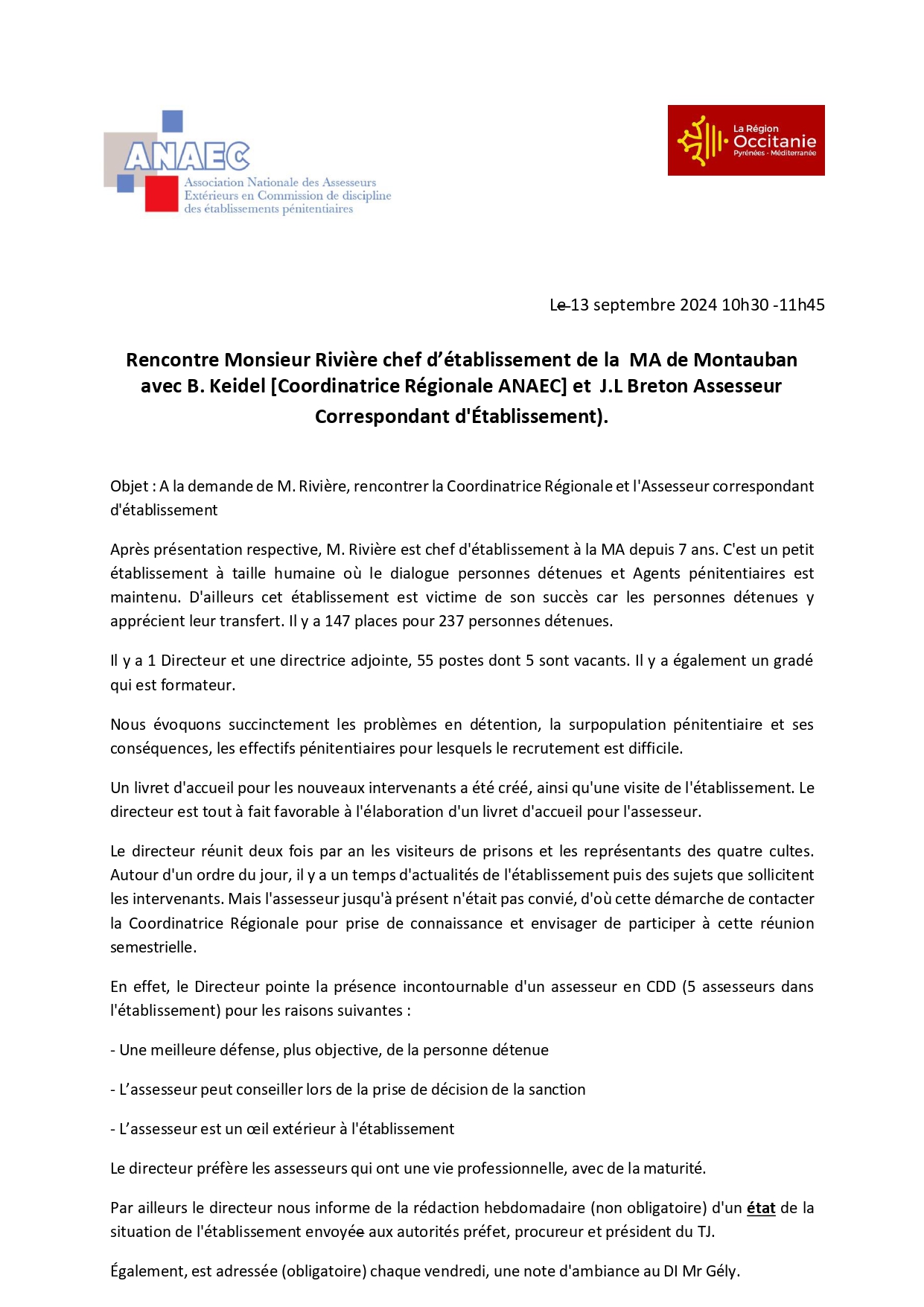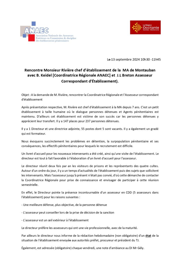 Vous trouverez ci-joint un rapport sur la rencontre ayant eu lieu entre les membres de l’ANAEC, B. Keidel (Coordinatrice Régionale) et J. L. Breton (Correspondant d’Etablissement) et le Chef d’établissement de la Maison d’Arrêt de Montauban, monsieur Rivière.